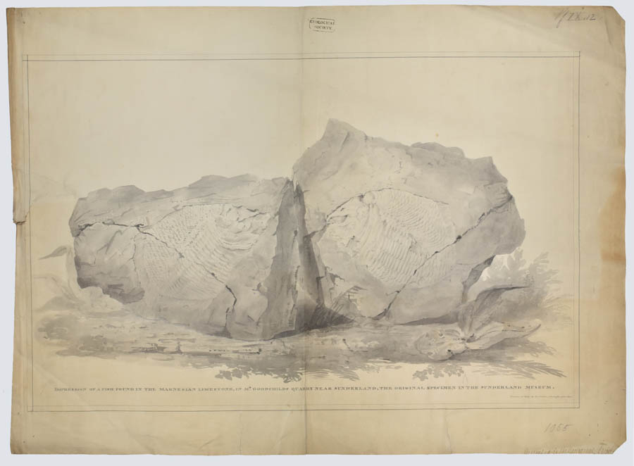 Extract from Greenough's map which likely references the fossil fish which appeared in Nathaniel John Winch’s paper "Observations on the Geology of Northumberland and Durham" (1817). On the right is the original artwork for the illustration which was published alongside the paper entitled 'Impression of a fish found in the Magnesian Limestone, in Mr [John] Goodchild's Quarry near Sunderland, the original specimen in the Sunderland Museum', by John Dobson [c.1814]. Ref: LDGSL/82/4. Click to enlarge.