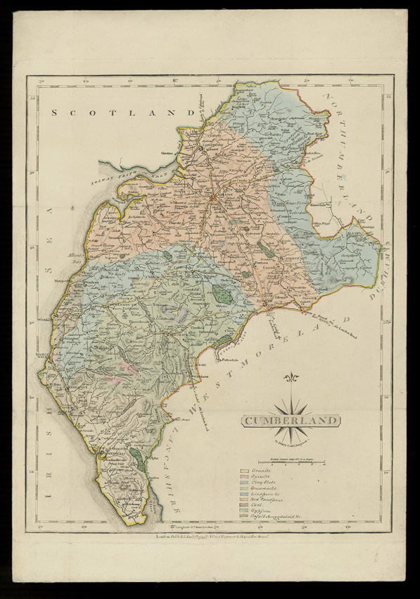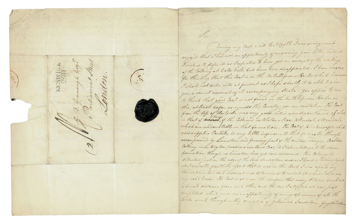 Joseph Fryer was a mining engineer of Lysick Hall, Cumberland, who corresponded with Greenough about his local region. The letter on the left from April 1814 contains Fryer's observations on the coal formations of Newcastle and Sunderland. Fryer also supplied Greenough with county maps from around the Lake District which he had geologically coloured.