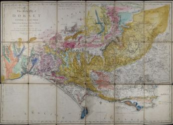 Geological colouring and notes by William Buckland on base map 'The County of Dorset surveyed by Isaac Taylor, reduced from the large map in six sheets...', published by William Faden, 1 July 1796. This map is one of two coloured on the same base map in the Buckland collection. The colour key on this version is in the hand of Greenough, indicating their collaboration. Ref: LDGSL/56/3/5. Click to enlarge