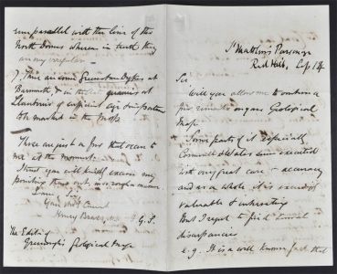Letter from the Rev Henry Brass, 14 Sep [1865-1869] detailing the errors in the new map. Archive ref: GSL/COM/MAP/3.  Click to enlarge.