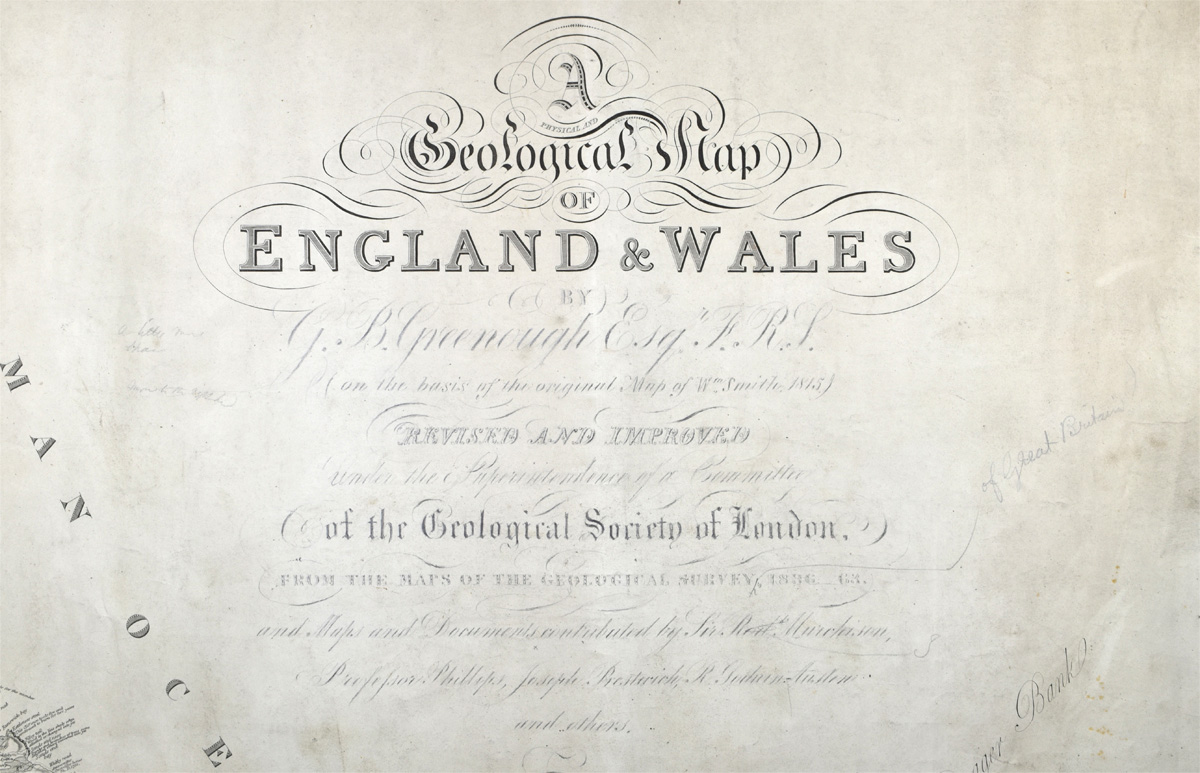 The geology and colouring of the map were not the only things which had been revised. The title plate now read: "Physical and Geological Map of England & Wales by G B Greenough, FRS (on the basis of the original map of Wm Smith 1815) revised and improved under the superintendence of a Committee of the Geological Society of London from the maps of the Geological Survey of Great Britain, 1836-63, and maps and documents contributed by Sir R I Murchison, Professor Phillips, Joseph Prestwich, R Godwin Austen, and others."
