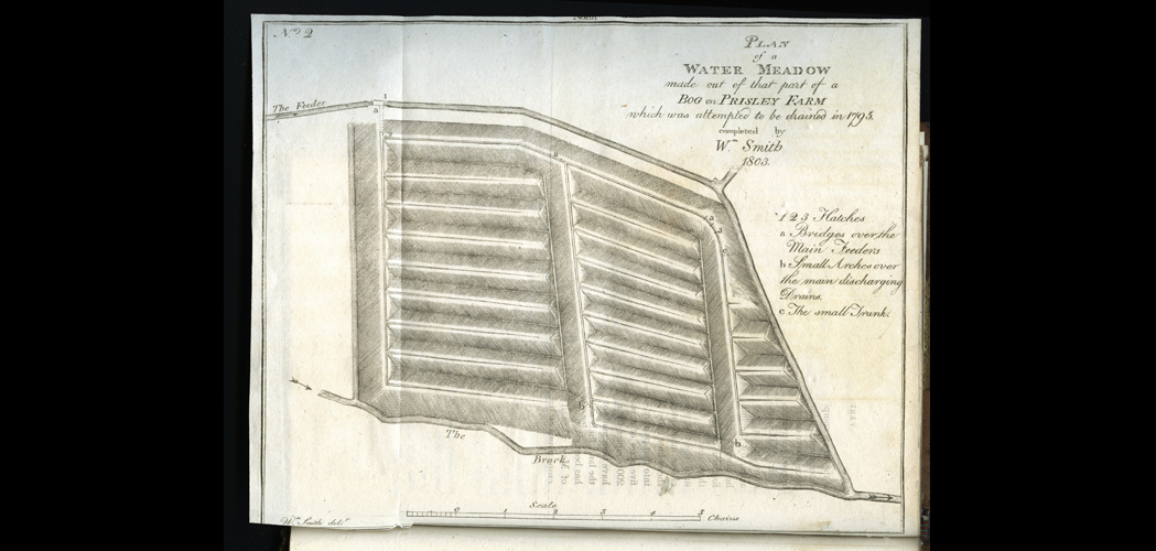 Smith published an account of this successful project in a number journals of the day, but also included it in his first published memoir in 1806 entitled 'Observations on the Utility, Form and Management of Water Meadows and the Draining and Irrigation of Peat Bogs, with an Account of Prisley Bog and other Extraordinary Improvements, Conducted for His Grace the Duke of Bedford, Thomas William Coke, Esq,MP, and Others’. This 'treatise of irrigation' is a rather wordy affair, with Smith frequently going off topic as well as taking the opportunity to include verses of his own poetry.