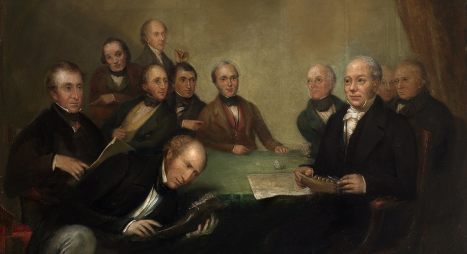 Geological section of the British Association Meeting at Newcastle, 1838. (GSL/POR/18). Murchison is the first figure on the left, seated directly next to him (with glasses) is De la Beche then Sedgwick. In the front of the picture, leaning down and inspecting a jawbone, is Smith's nephew John Phillips.